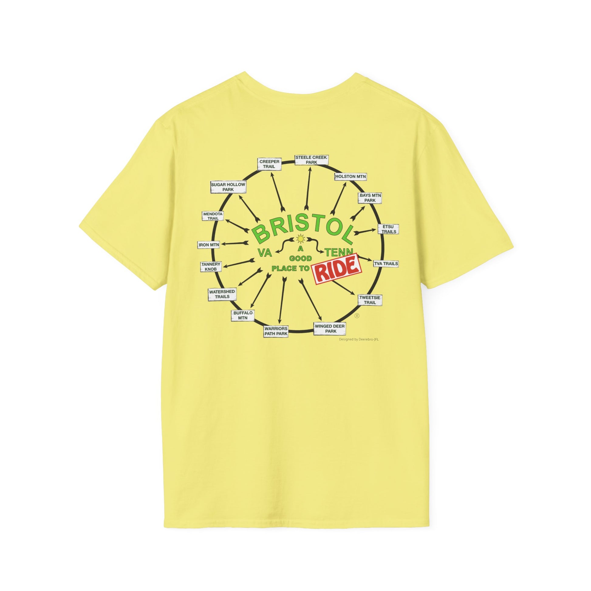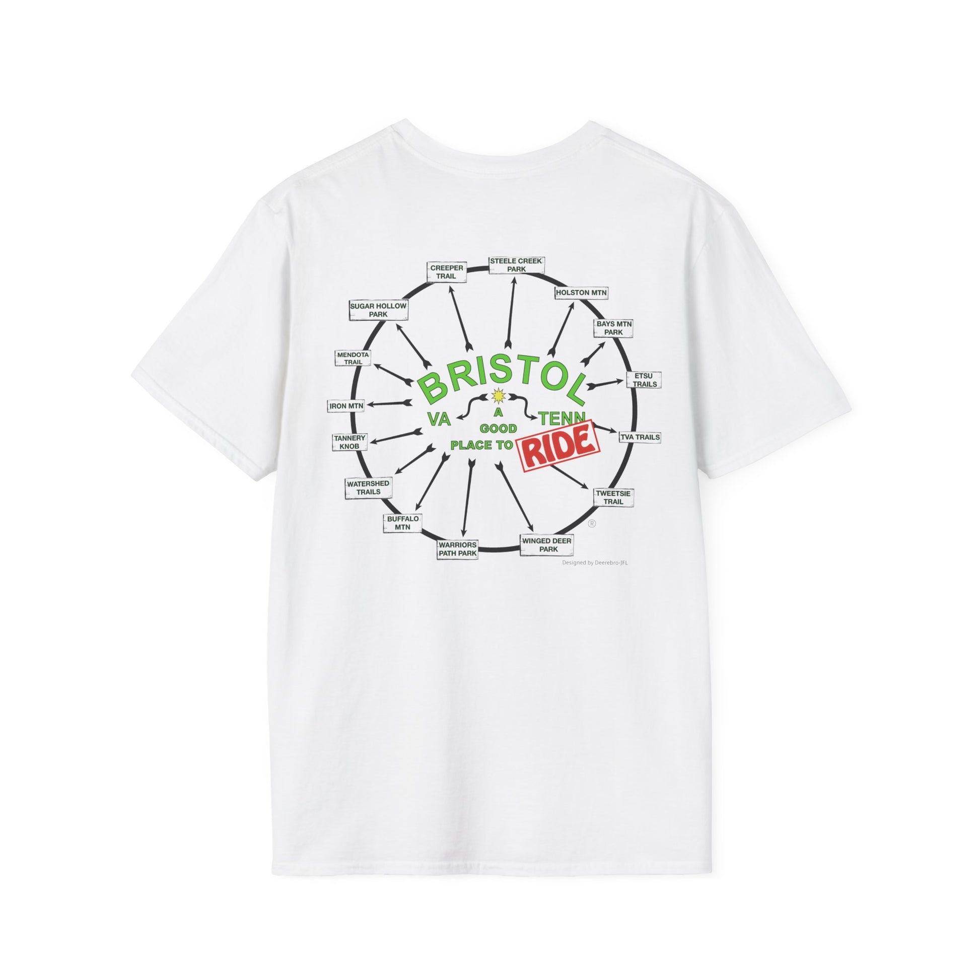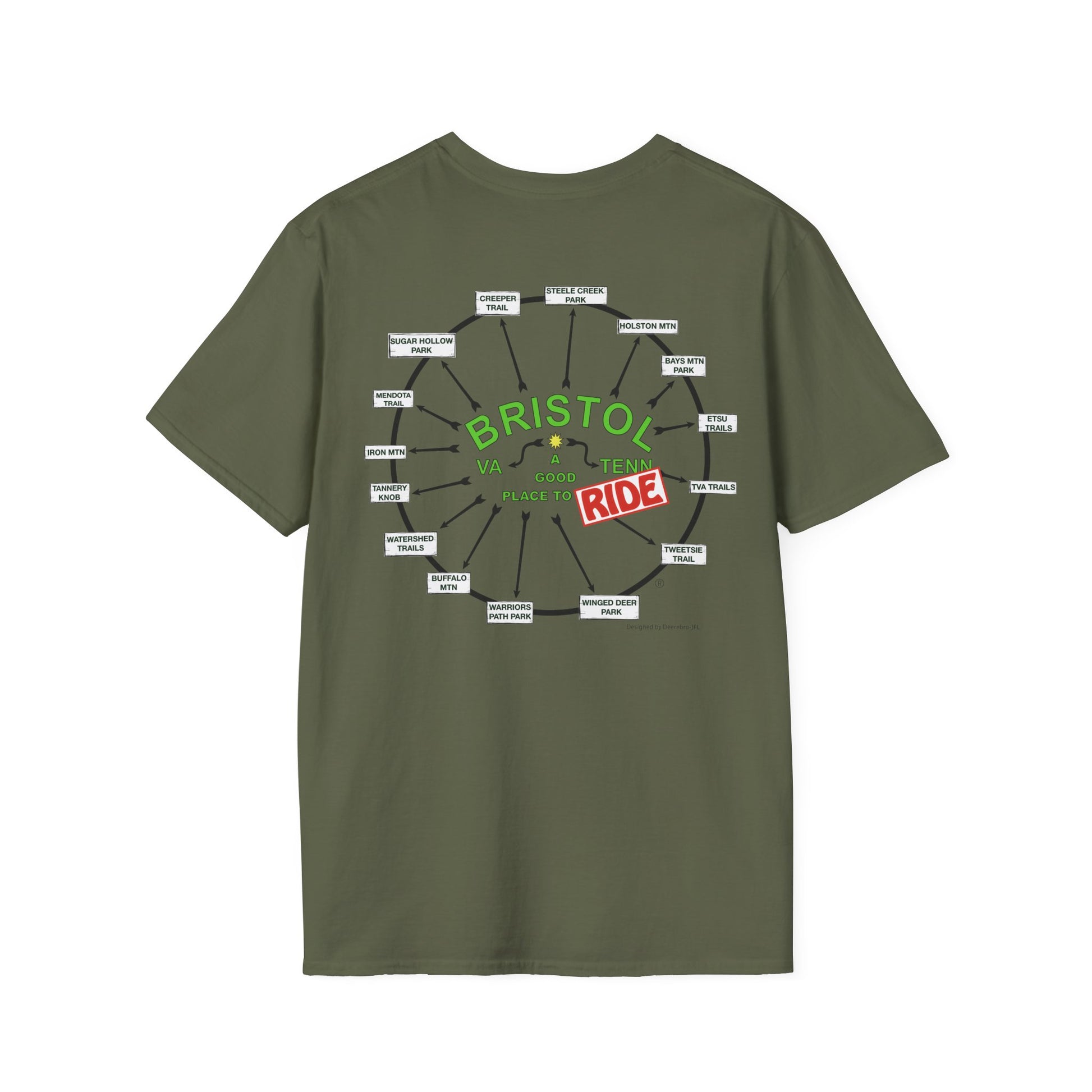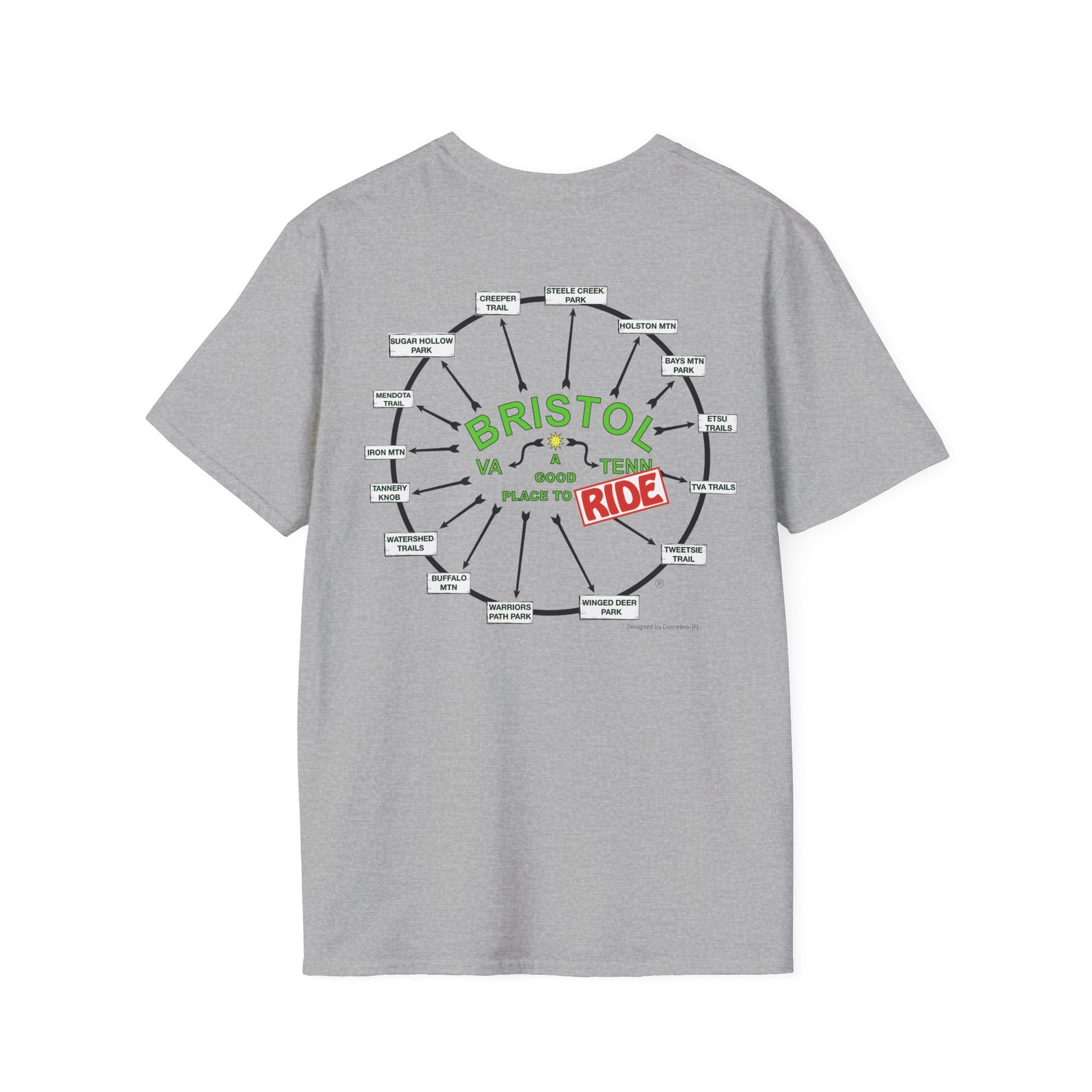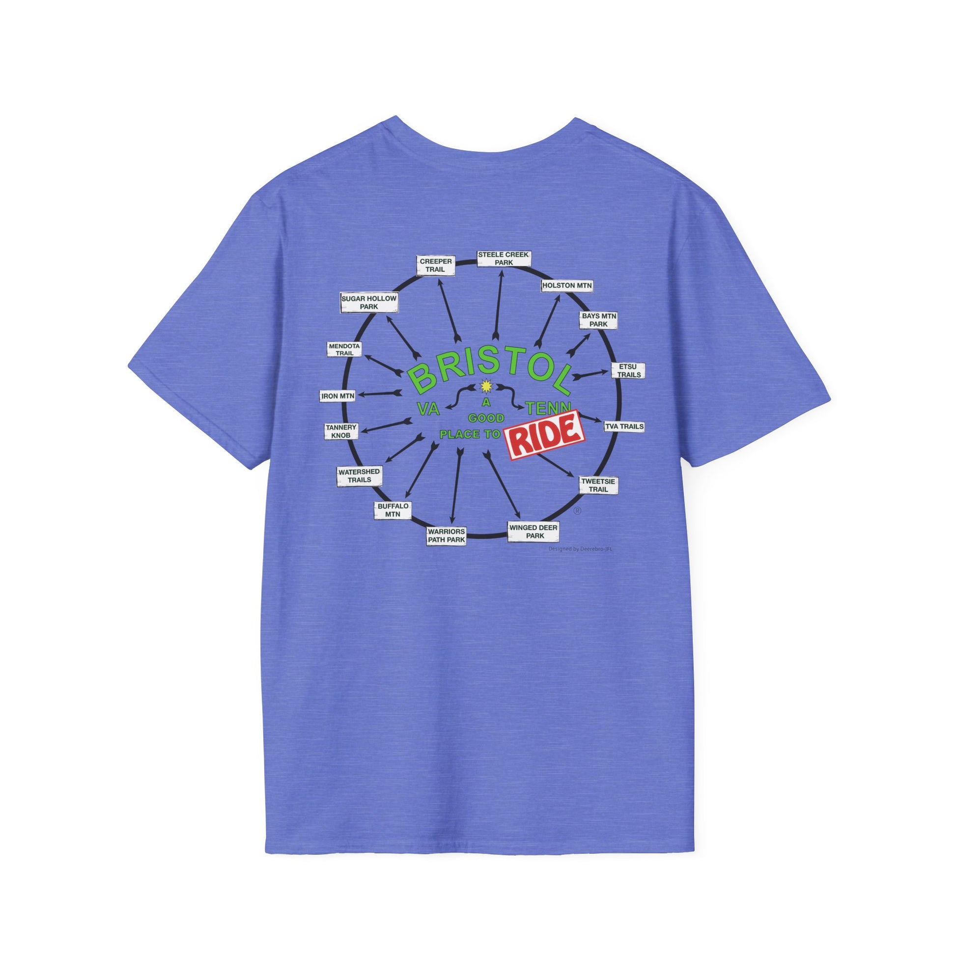 A comfortable and durable T-Shirt featuring a design that celebrates Bristol TN-VA as a great destination for riders with numerous trails. Perfect for outdoor enthusiasts and cyclists looking to show their love for the area. Ideal for casual wear or as a gift for someone who enjoys biking and exploring. Relevant for outdoor events, biking holidays, and adventure enthusiasts.